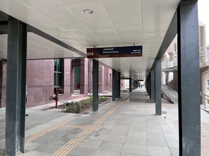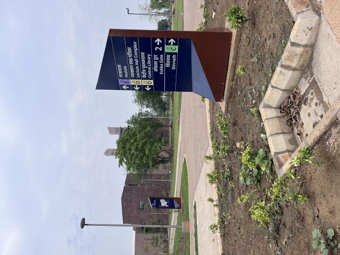 The campus is planned in zones and the wayfinding strategy assigned them alphabetical identity and Colour. The sign types responded to the type of movement and visual information created a simple, recognizable and legible messaging graphics. The buildings are named taking inspiration from the scientific achievers from India's history.
