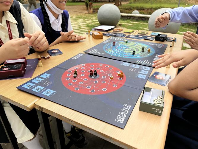 The game weaves real science concepts such as magnetic equators and heliocentric orbits into its game play. A booklet supplied with the game titled “Science Behind the Game” helps explain the scientific theories for rocket launch, inter-planetary travel, resources on Mars to make the game play engaging.